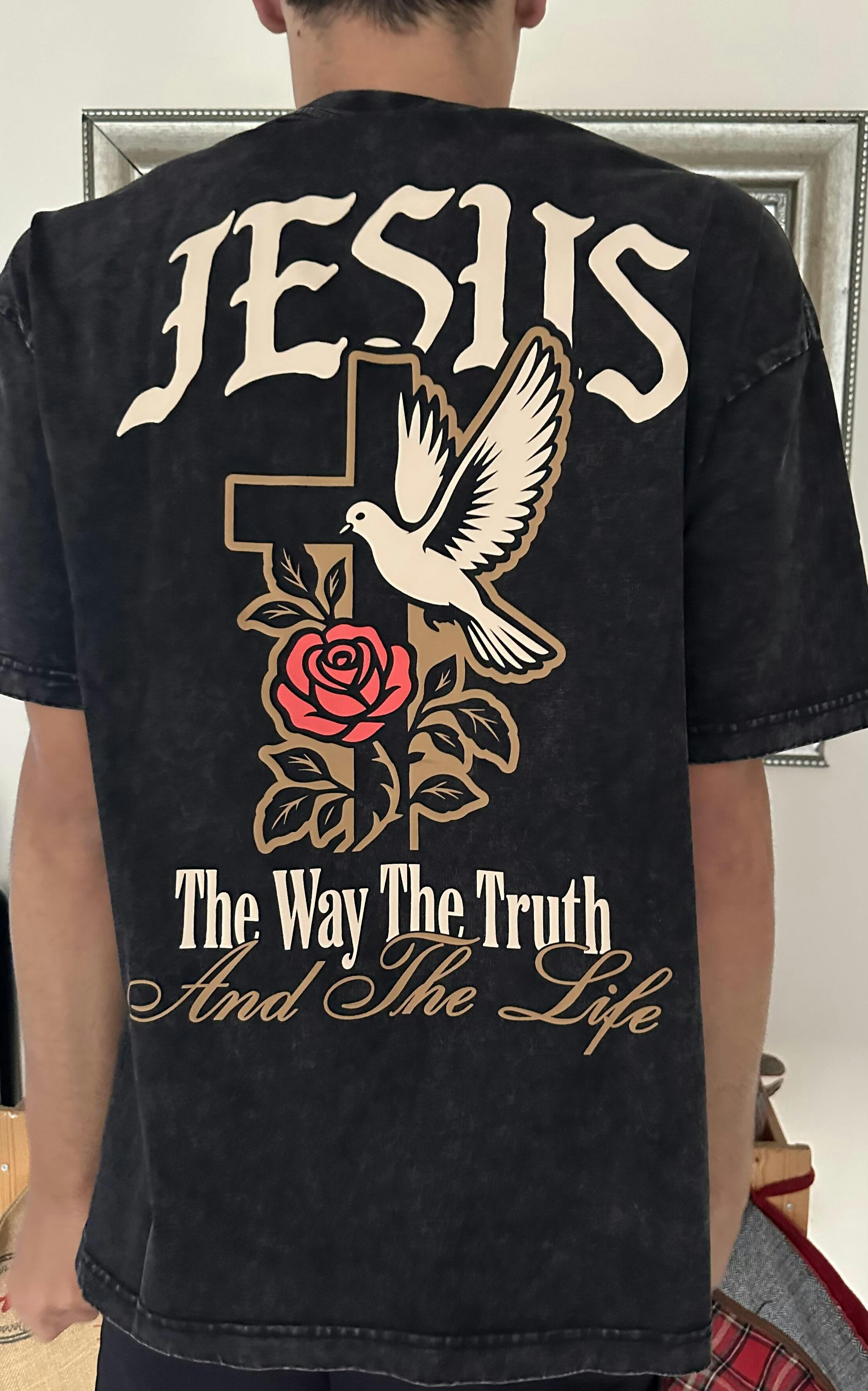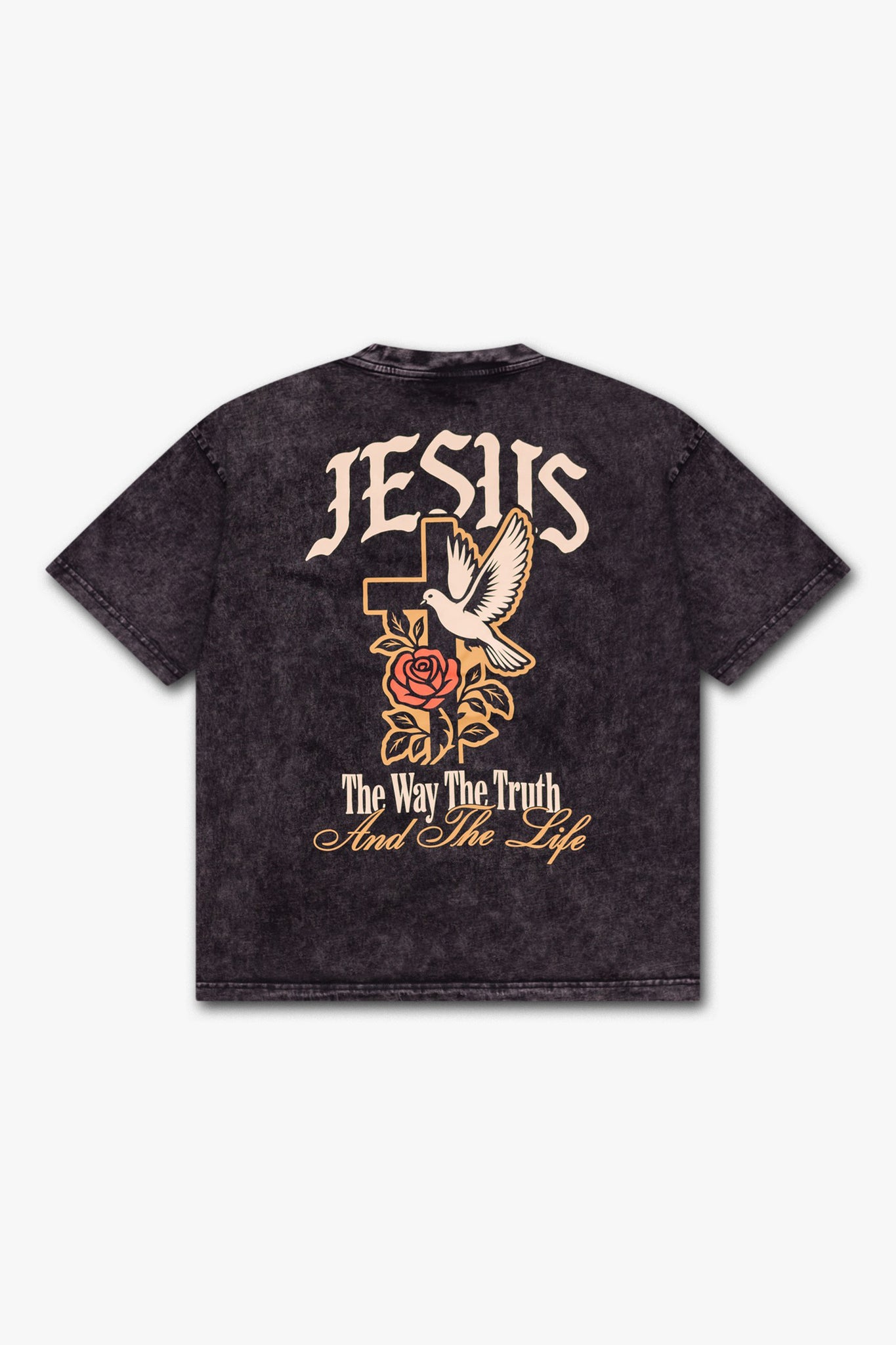 Cut from premium 260gsm cotton and finished in a washed black tone, this T-shirt speaks with quiet boldness. The name above all names - JESUS - takes centre focus on the back in a refined, minimal layout. Designed to be worn with purpose, the garment pairs weight and comfort with a message that endures beyond trend.